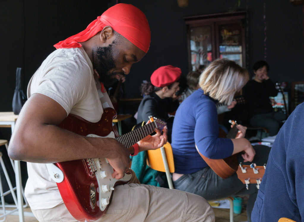 Loads of resources to learn from at home, access to other specific interest workshops such as songwriting, access to exclusive learners-only events at our venue where you can meet other musicians at different stages of their playing journey, and the course culminates in a chance to perform in front of a crowd of about seventy people. Only if you want to, though.